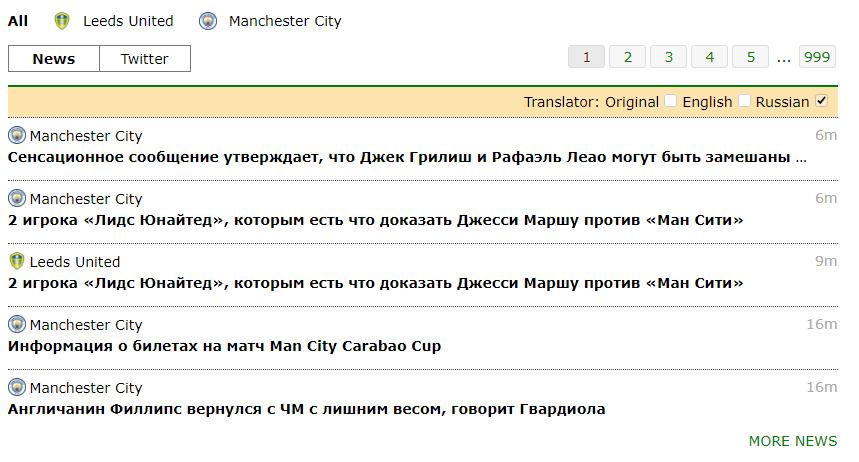По каждому матчу выводятся оперативные новости от первоисточников (официальные сайты клубов, журналисты, авторитетные издания)