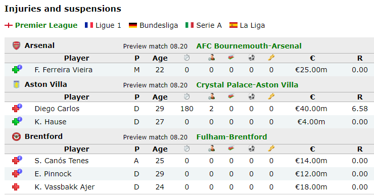 В разделе Травмы и дисквалификации по каждой лиге публикуется таблица с травмированными и дисквалифицированными игроками. Здесь наглядно видно количество отсутствующих игроков в каждой команде.